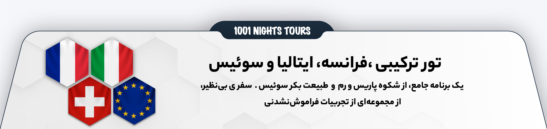 آژانس سفرهای هزار و یکشب مجری مستقیم تورهای نمایشگاهی اروپا و تورهای اروپایی با افتخار تور ترکیبی ۱۱ روزه فرانسه، ایتالیا و سوئیس را به شما معرفی می‌کند؛ سفری منحصربه‌فرد که شما را به قلب زیبایی‌های تاریخی، فرهنگی و طبیعی اروپا می‌برد. این تور به گونه‌ای طراحی شده تا در یک برنامه جامع، هم از شکوه پاریس و رم لذت ببرید و هم با طبیعت بکر سوئیس آشنا شوید. این سفر بی‌نظیر، مجموعه‌ای از تجربیات فراموش‌نشدنی را برای شما به ارمغان خواهد آورد.